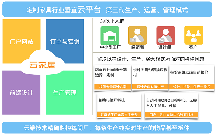 云家居,是广州市新信荟智信息产业有限公司历时3年时间打造的定制家具行业平台式产品。 针对 定制家具行业标准不统一、人为因素造成出错率居高不下、生产周期长的痛点,我们推出了云家居 系列产品,为大中小型定制企业解决以往及现今设计、生产、经营模式所面对的种种问题,从方案 设计、云端报价、拆单、自动对接开料机、自动对接CNC、 订单生产管理提供全方位的方案。 目前在定制家具行业,主流的生产模式虽已实现软件+设备(部分大企业实现专业软件+数码设备), 但普遍存在问题: • 周期长(从客户确定方案到生产出货需要30 — 40天时间) • 出错多(工厂出厂的错误比例在15% — 40%左右) • 服务不到位(在客户家一次性安装成功的比例为50% — 80%,补件时间长) • 人员成本高(需要大量技术工,如拆单、排钻人员,且淡季工人闲置,旺季人手不足) 云家居正是解决这些问题的全新第三代生产、运营、管理工具。