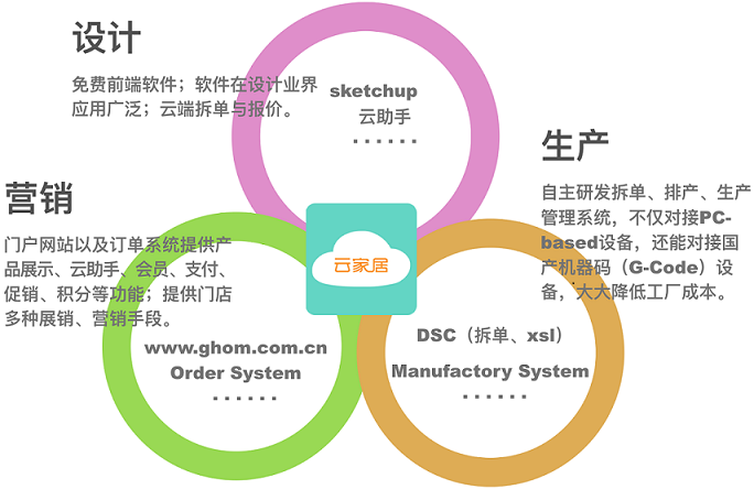 云家居门户网站以及订单系统提供产品展示、云助手、会员、支付、促销、积分等功能, 并支持提供门店多种展销、营销手段。 在设计阶段,云家居提供免费的前端软件,该软件在设计业界应用广泛,经过我们的二次 开发,完全适配了定制家具设计的特点,并能在云端进行拆单与报价,且报价方式灵活多 样,满足不同厂家针对不同经销商的报价体系。 在生产阶段,我们自主研发的拆单、排产、生产管理系统,不仅能对接PC- based设备, 还能对接国产机器码(G-Code)设备,大大降低工厂成本。